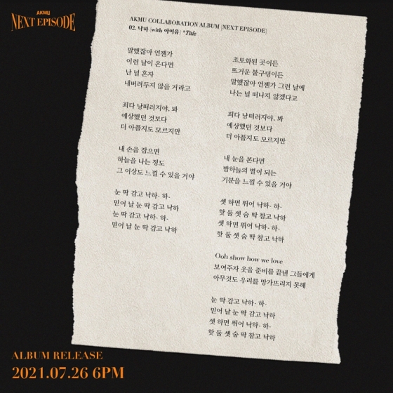 AKMU의 타이틀곡 '낙하' (with 아이유) 가사 전체를 담은 리릭 포스터가 23일 공개됐다. 과감한 프로모션만큼이나 고정관념을 뒤엎는 이들의 감성이 참신해 음악팬들을 설레게 한다.