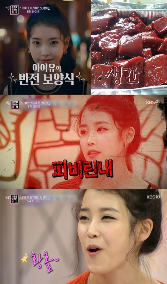 아이유의 반전 보양식은 바로 생간. 과거 한 예능프로그램에서 아이유는 "진짜 맛있게 생기지 않았나. 빨개 가지고. 피비린내 맛이 난다"며 생간을 먹는 모습을 직접 보여준 바 있다.