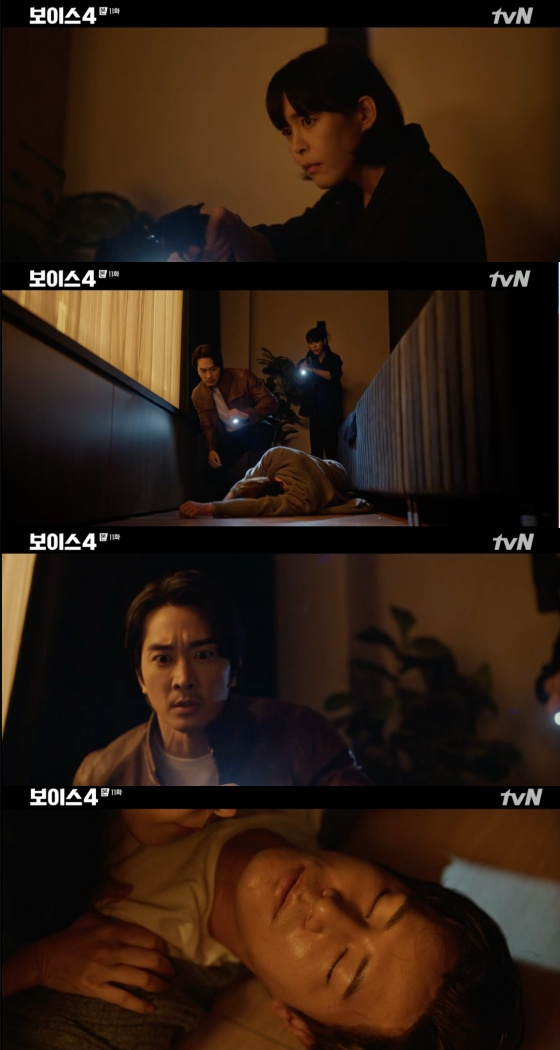 '보이스 시즌4'의 이하나와 송승헌이 칼에 찔려 의식 잃은 이규형을 발견했다.