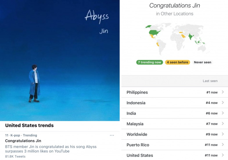 트위터에서는 'Congratulations Jin'이 월드와이드 트렌드 9위, 필리핀 실시간 트렌드 1위, 인도네시아 실시간 트렌드 4위, 미국 실시간 트렌드 11위에 오르는 등 전 세계 실시간 트렌드를 뜨겁게 달구며 진과 '어비스'에 대한 뜨거운 관심과 인기를 입증했다.