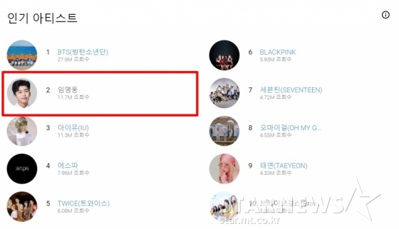 25일 유튜브 통계에 따르면 임영웅은 이날 기준 유튜브 한국 최근 7일 조회수 1170만 뷰를 기록, 인기 아티스트 2위를 기록했다.