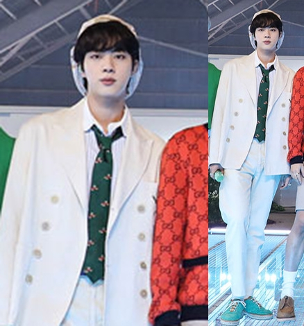 공개된 사진 속에 진은 화사한 화이트 더블슈트에 초록색 바탕의 패턴넥타이로 시원한 느낌의 베레모를 착용한 모습을 보였다
