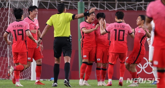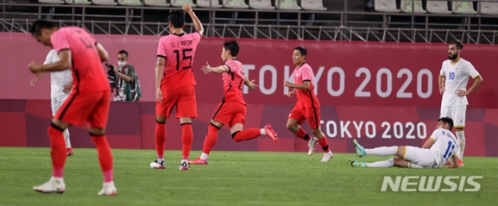 한국은 25일 오후 8시 일본 이바라키현의 가시마 스타디움에서 열린 2020 도쿄 올림픽 남자 축구 조별리그 B조 2차전 루마니아와의 경기에서 수적 우세 속에 상대 자책골과 이동경-이강인의 연속포에 힘입어 4-0 완승을 거뒀다.