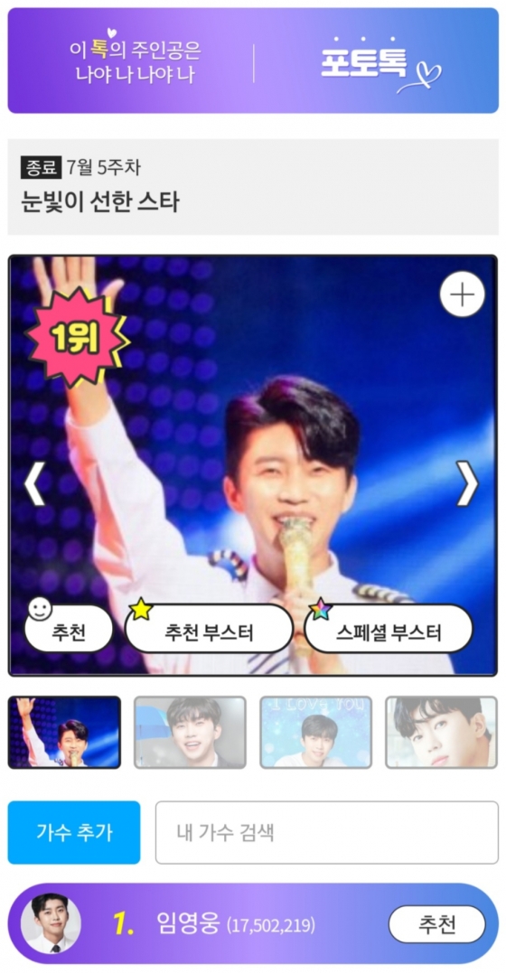 가수 임영웅이 포토톡 '눈빛이 선한 스타' 1위에 올랐다.