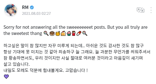 RM은 "Sorry for not answering all the sweeeeeeeet posts. But you all truly are the sweetest thang"이라고 영어로도 진한 팬사랑을 전했다.