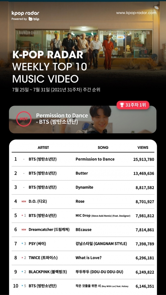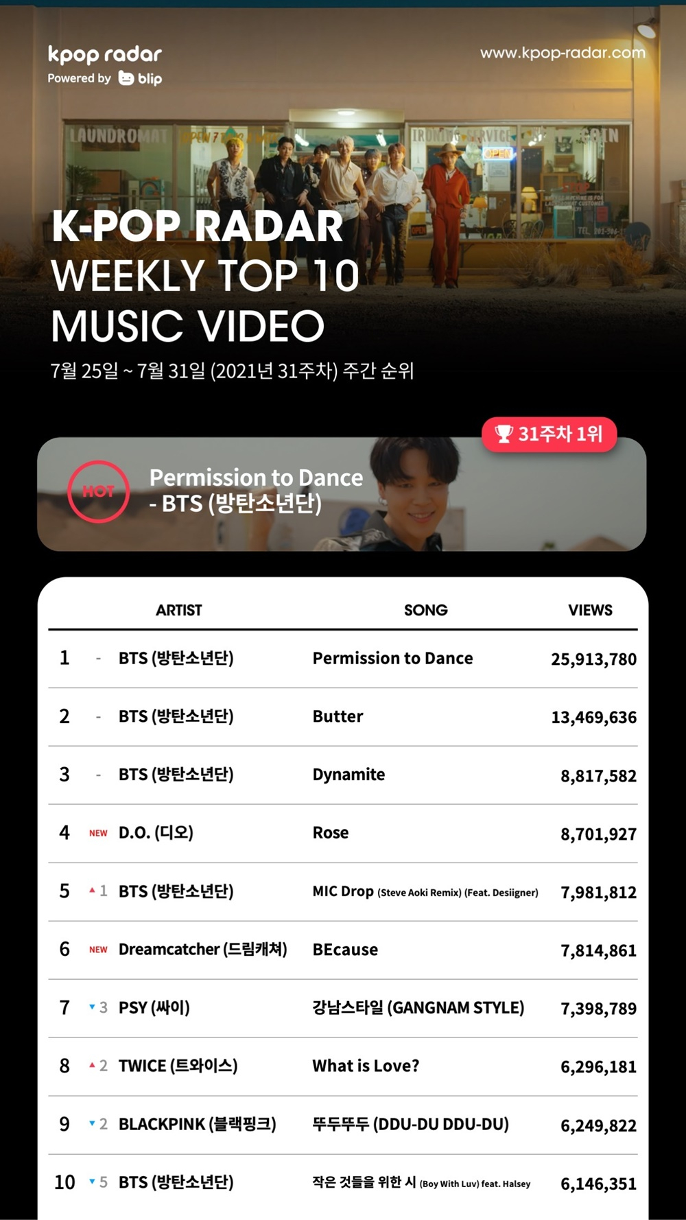 방탄소년단의 8번째 디지털 싱글인 'Permission to Dance' 뮤직비디오는 케이팝 레이더 31주차 집계 기간 (7월 25일 ~ 7월 31일) 동안 2,591만 뷰를 기록하며, 4주 연속 1위를 차지했다.