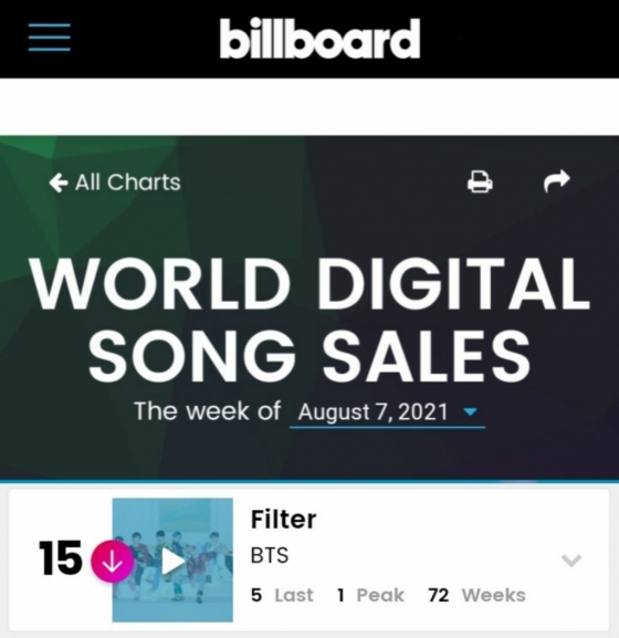 지난해 2월 발매된 방탄소년단 MAP OF THE SOUL : 7 앨범 수록곡이자 지민의 솔로곡 '필터'는 지난 2일(현지시간) 빌보드가 발표한 8월 7일자 빌보드 월드 디지털 송 세일즈 차트에서 15위를 기록했다. '필터'는 이 차트에서 방탄소년단 노래 중 가장 높은 순위를 기록했다.