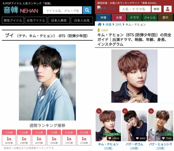 뷔는 일본 인기 랭킹 사이트 '네한(音韓)'에서 지난 7월 26일부터 8월 1일까지 진행한 'KPOP 남성 아이돌 랭킹' 투표에서 1만 8761표를 획득해 1위에 올랐다. 이로써 뷔는 18주 연속 장기간 1위의 자리를 지키고 있다.