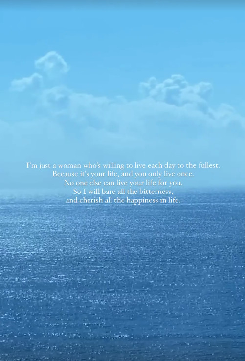 이어 "왜냐하면 그건 네 인생이고, 넌 한 번밖에 살지 않으니까, 아무도 널 위해 네 삶을 살아주지 않아(Because it's your life, and you only live once. No one else live your life for you.)"라며 "그래서 난 모든 쓰라림에서 벗어나 인생의 행복을 소중히 여길 것(So I will bare all the bitterness, and cherish all the happiness in life)"이라고 다짐했다.