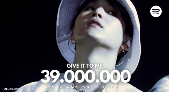 어거스트 디 첫 번째 믹스 테이프 'Agust D' 수록곡 'give it to me'가 세계 최대 음원 플랫폼 스포티파이(Spotify)에서 11일 스포티파이 3900만 스프리밍을 돌파했다.
