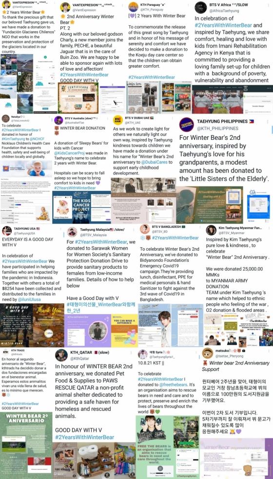 방탄소년단(BTS) 뷔의 자작곡 '윈터 베어'(Winter Bear) 발표 2주년을 맞아 전 세계 팬들이 축하와 함께 소외된 이웃을 돌아보는 뜻 깊은 시간을 가졌다.
