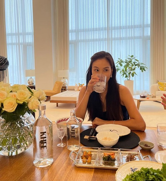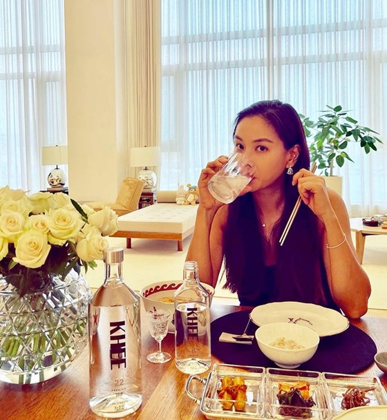 사진 속 고소영은 우아한 자태를 뽐내며 고급 소주를 마시고 있다.