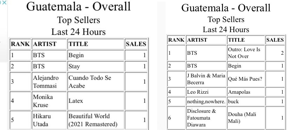 같은 날 'Begin'은 그 뒤를 이어 과테말라 아이튠즈 톱 송 차트 2위에 머물렀다.