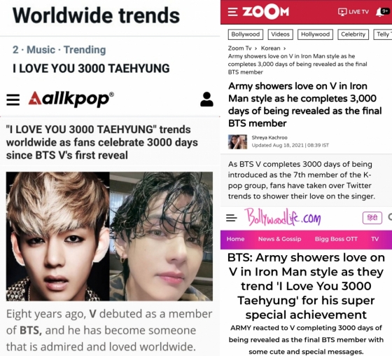 팬들은 뷔가 첫 트위터를 남기며 존재를 알린 3000일을 기념하며 "I LOVE YOU 3000 TAEHYUNG"으로 축하했다. 팬들은 뷔가 쓴 아이언 모자에서 영감을 받아 토니 스타크에게 딸이 "I LOVE YOU 3000"이라고 한 대사에서 따왔다. "I LOVE YOU 3000 TAEHYUNG"은 월드와이드 실시간 트렌드 2위를 장식했다.