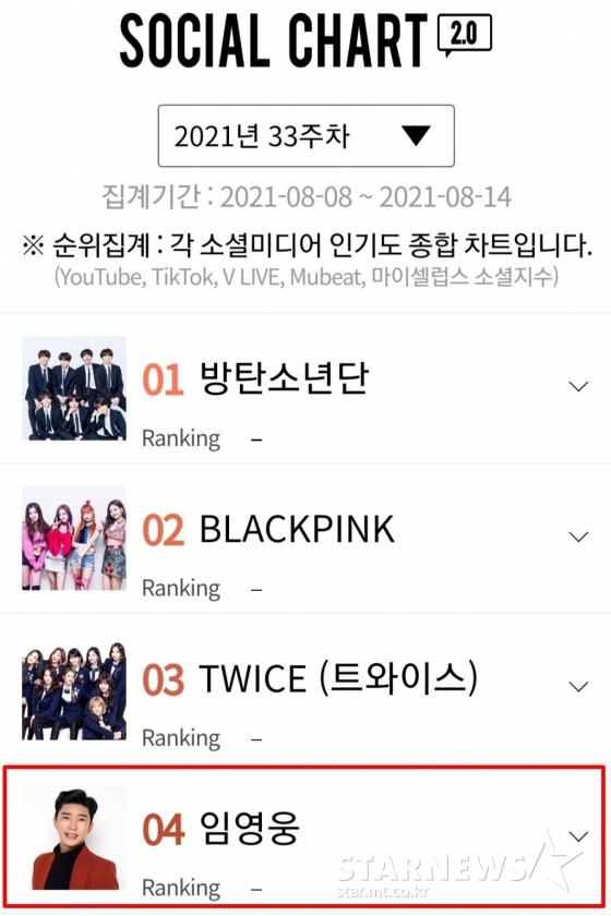 임영웅은 가온차트 33주차(2021년 8월 8일~2021년 8월 14일) 소셜차트 4위를 기록했다. 31주차부터 3주 연속 톱4 기록이다.