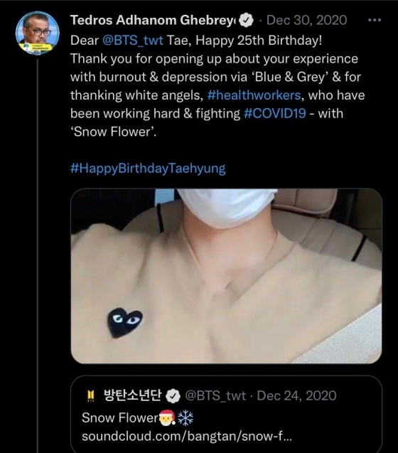세계 보건기구(WHO) 사무총장 테드로스 아드하놈 게브레예수스(Tedros Adhanom Ghebreyesus)는 지난해 뷔의 생일, 자신의 SNS에 "블루 앤 그레이를 통해 번아웃과 우울의 경험을 공유해줘서 감사하다"며 고마움을 담은 글을 게재해 눈길을 끌기도 했다.