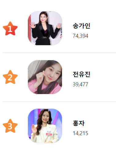 3주 연속 1위를 차지하고 있는 송가인의 뒤엔 전유진, 홍자가 나란히 섰다. 2위 전유진은 3만 9477표를 획득했으며 홍자는 3위로, 1만 4215표를 획득했다.