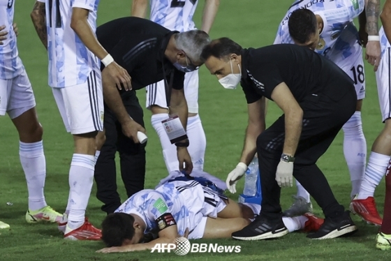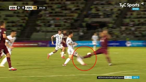 전반부터 아르헨티나가 베네수엘라를 일방적으로 몰아붙였다. 그런데 가슴이 철렁한 장면이 발생했다. 전반 28분 메시가 드리블 돌파로 공격을 전개하는 과정에서 상대 수비수 아드리안 마르티네스의 거친 태클에 쓰러졌다. 메시의 진루를 막고자 했던 마르티네스는 스터드를 들고 달려들었고, 그대로 메시의 왼쪽 정강이를 가격했다.