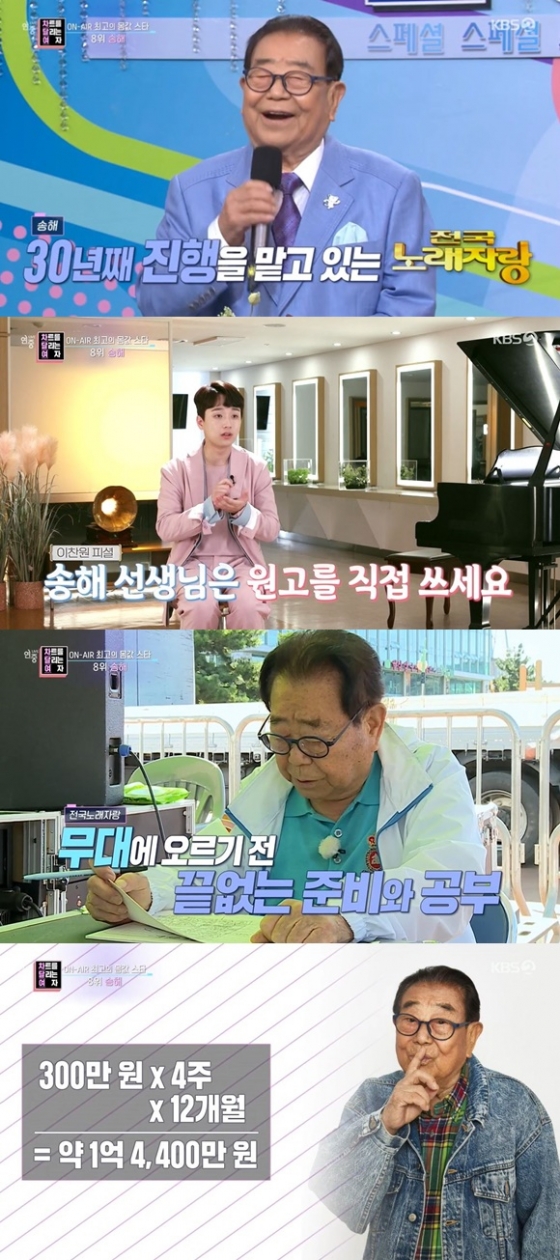 이어 공개된 송해의 출연료는 '전국 노래자랑 1회 출연료는 300만 원, 이를 1년으로 계산하면 약 1억 4천4백만 원에 해당한다. 또한 각종 CF 출연 등으로 부가 수입을 올리고 있다.