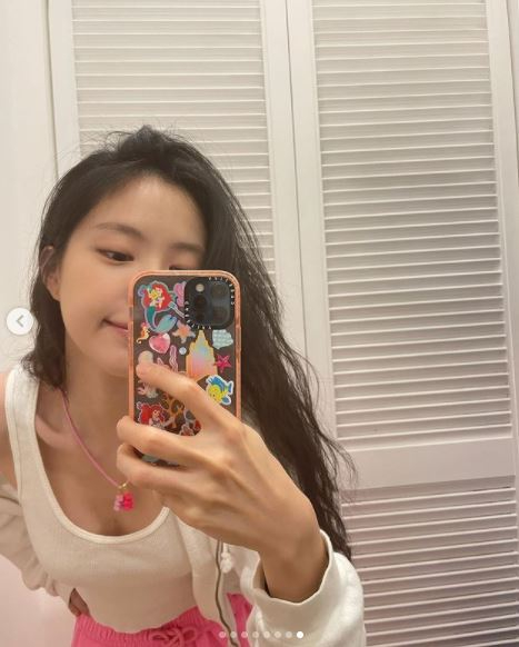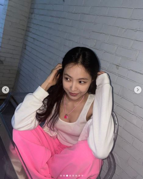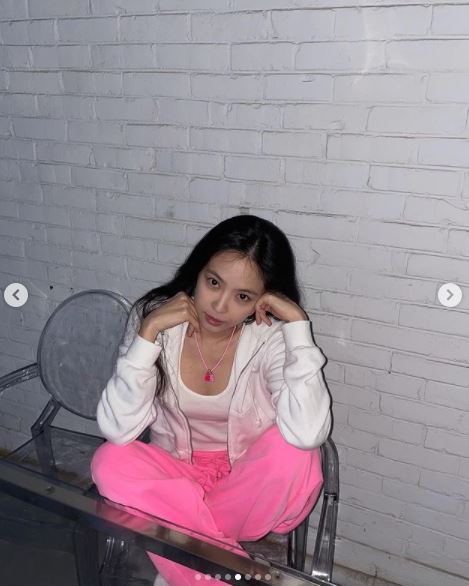사진에서 손나은은 흰색 민소매 티셔츠와 짧은 후드 점퍼를 걸치고 핑크색 트레이닝 팬츠를 입고 묘한 포즈를 취하고 있다.