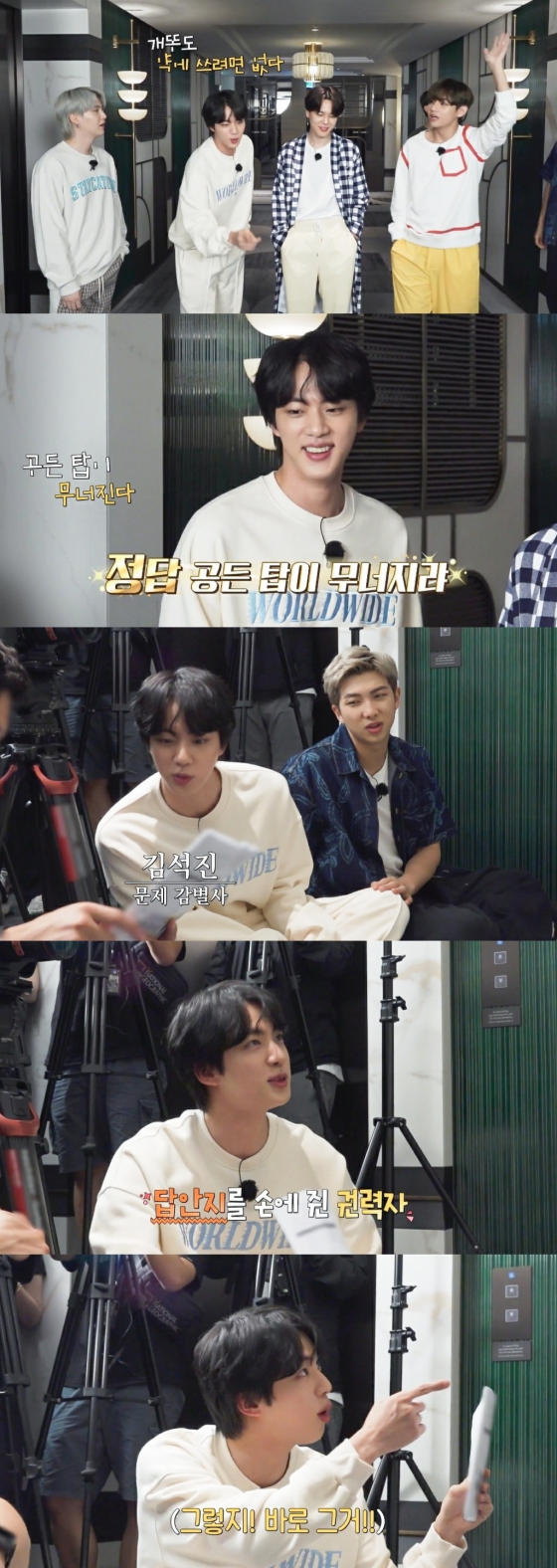 문제를 맞히고 방을 배정받은 진은 제작진들이 있는 일명 VIP석으로 이동을 해 바닥에 앉아 어느새 자연스럽게 진행자가 되어 멤버들에게 '신조어' 문제를 출제하기 시작했다. 서로를 너무 잘 아는 멤버들이기에 문제를 출제하는 진도 문제를 푸는 멤버들도 몰입도가 최고조에 이르러 문제를 푸는 분위기는 마치 축제의 현장같았다.