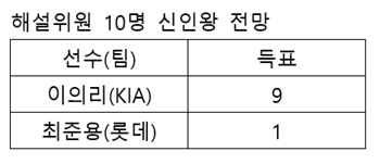 A 위원은 "이의리밖에 없지 않나. 팀 성적이나 승운이 따르지 않아 아쉽긴 한데 현재까지는 독보적이지 않을까 생각한다"며 "물론 10승도 하고 팀도 5강에 드는 등 좀 더 멋지게 상을 받으면 좋을 것이다. 하지만 현재로선 이의리만큼의 기록이나 지표를 가진 선수들이 안 보인다"고 말했다.
