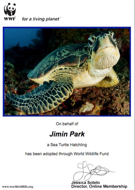 지민의 미국 팬베이스 'JIMINDATA'는 지민의 생일달 '짐토버' 시작인 10월 1일 #HelloJimtober와 함께 '지민의 27번째 생일을 축하하며 동물에 대한 사랑과 감사를 담아 '월드 와이드 펀드'(WWF)를 통해 새끼 바다 거북을 입양했다'고 밝혔다.