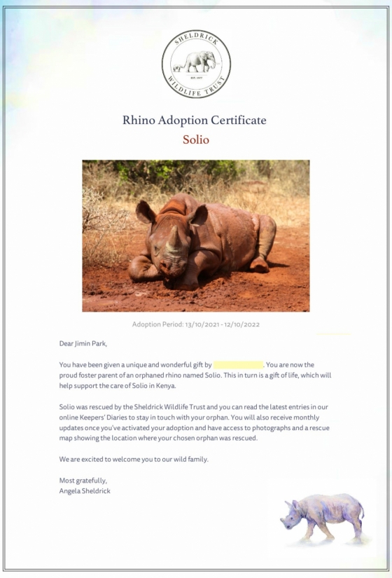 지민의 글로벌 팬도 케냐 고아 코끼리 구조 및 야생 동물 재활 프로그램을 운영하는'셀드릭 트러스트'(Sheldrick Trust)와 함께 리노(Rhino)라는 이름을 가진 코뿔소를 입양한 사실을 공개했다.