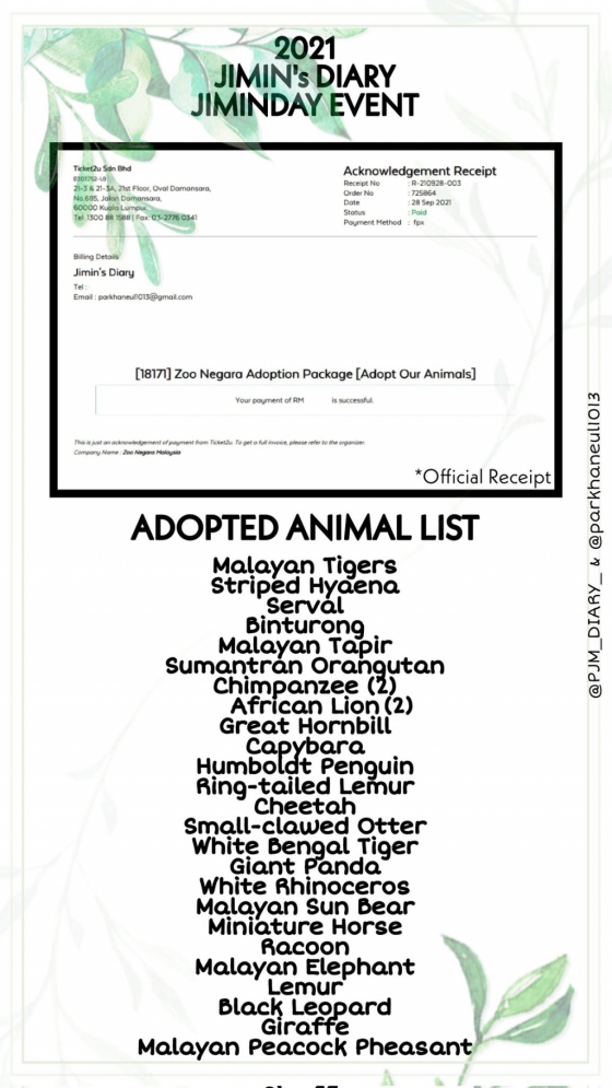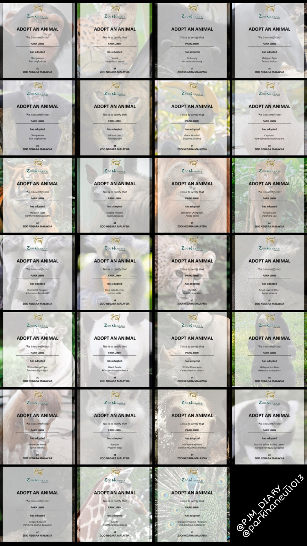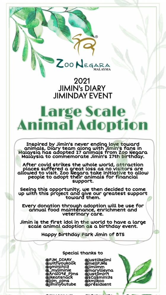 또 다른 팬베이스 'JIMIN's DIARY'와 팬들도 '지민의 27번째 생일을 기념하기 위해 말레이시아의 네가라 동물원(Zoo Negara)에서 말레이시아 호랑이를 비롯해 모두 27마리의 동물을 입양했다'고 밝혔다.