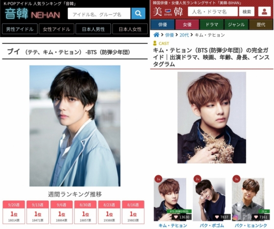 또한 뷔는 같은 주간 일본의 한국 배우 인기 랭킹 사이트 '비한(美韓)'의 '20대 한국 배우' 랭킹에서 1만 3630표를 얻어 20주 연속 1위를 기록했다.