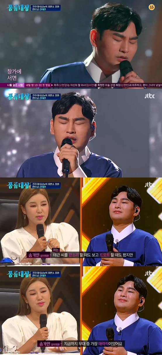송가인은 "태관이는 나와 대학교를 같이 다닌 후배다. 태관이를 판소리 할 때도 보고 트로트 할 때도 봤지만, 오늘처럼 국악을 가요에 겸비해서 부르는 모습이 지금까지 무대 중 가장 매력적이었다"라고 극찬했다.