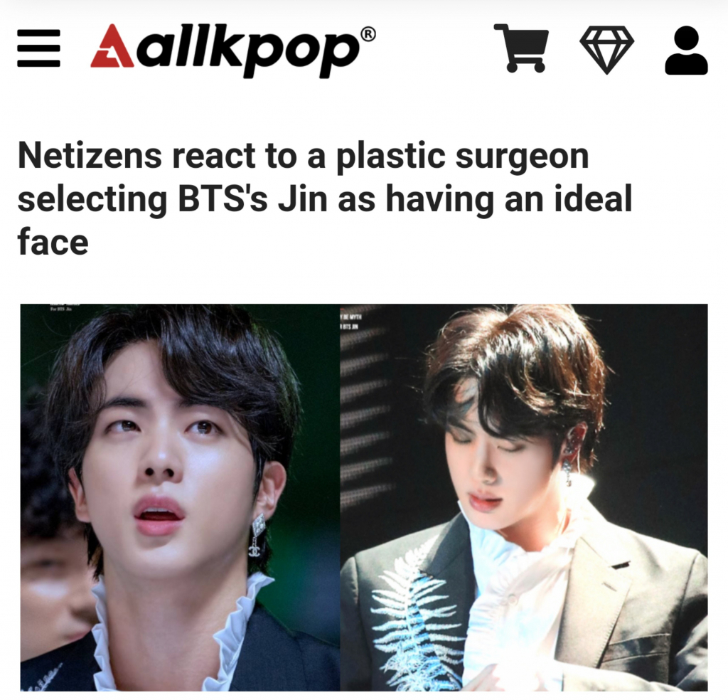 방탄소년단(BTS) 진의 얼굴이 성형외과 전문의로부터 이상적인 얼굴로 뽑힌 것에 관한 반응이 뜨겁다.