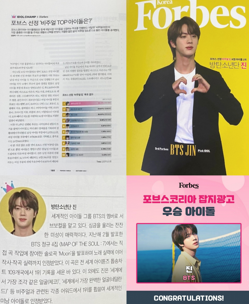 포브스 코리아는 진의 빼어난 보컬과 작사, 작곡 실력도 함께 언급하며 진을 세계에서 가장 조각 같은 얼굴(체코), 세계에서 가장 완벽한 얼굴(네덜란드) 등 비주얼과 관련된 각종 어워드에서 1위를 휩쓰는 세계적인 미남 아이돌이라고 소개했다.