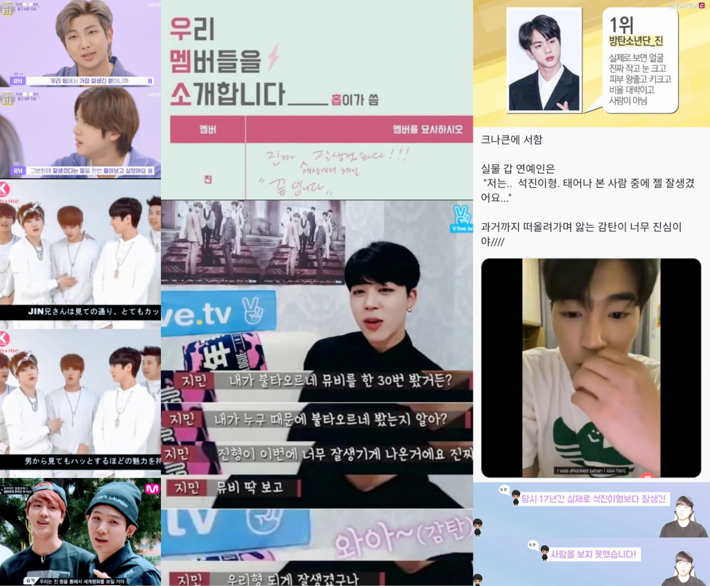김진성 원장은 방탄소년단 멤버 모두의 고유한 매력을 칭찬했다. 특히 "진씨의 경우 긴 무쌍꺼풀의 눈이 깔끔하며 남성적인 느낌을 준다", "눈의 가로폭이 길면서 눈밑선이 부드럽게 내려가있다", "콧대도 높고 자연스러운 코모양을 가지고 있다", "코끝에서 입술로 이어지는 라인도 이상적이고 특히 도톰한 아랫입술이 매력적이다", "무엇보다도 얼굴 전반적인 비율이 좋고 밸런스가 좋아서 드라마 속에서도 미남으로 나오는 얼굴이다"라고 분석하며 진의 얼굴을 극찬했다.