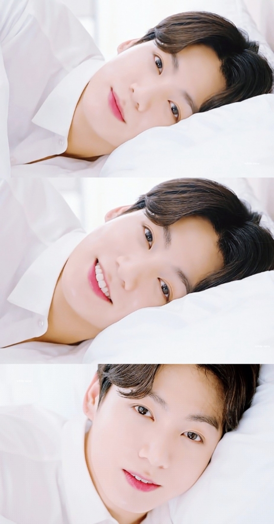 이 중 멤버 정국은 침대에 누워 블링 블링한 눈부신 미모와 해사한 미소로 마치 꿈 속에서 볼법한 달콤하고 환상적인 무드를 선사해 여심에 설렘을 선사해 시선을 강탈했다.