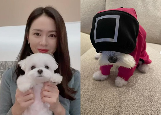 손예진은 20일 자신의 인스타그램에 반려견의 사진을 게재했다. 공개 된 사진 속에는 넷플릭스 '오징어게임' 요원 옷을 입고 있는 반려견의 모습이 담겨 있다. 마치 가면을 쓴 듯 후드를 눌러 쓰고 고개를 숙인 강아지가 너무나 귀엽다.