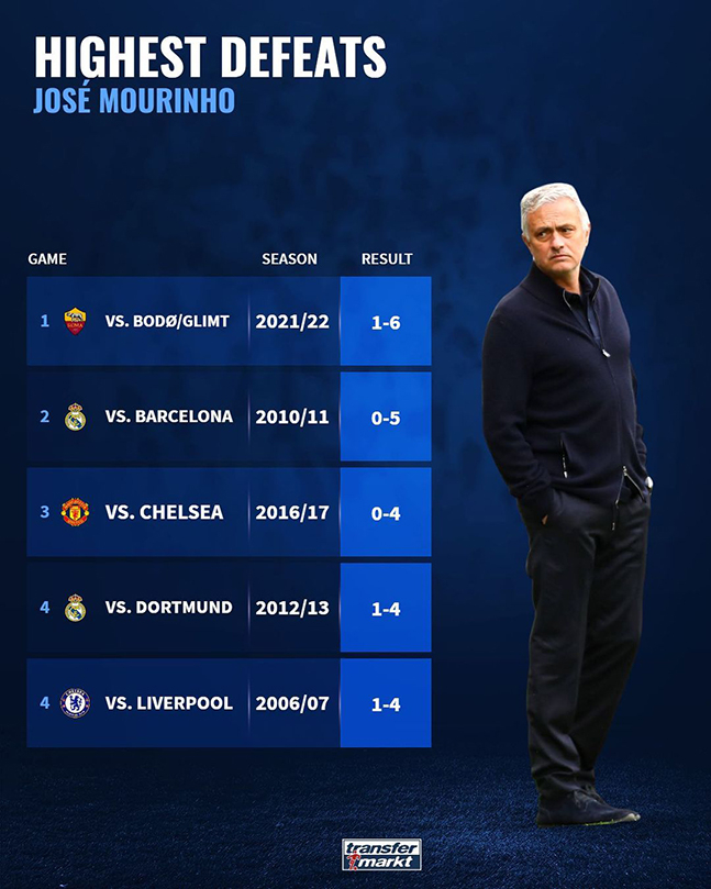 한편 보되/글림트전 6실점 기록은 무리뉴 감독이 데뷔한 이래 1008경기 만에 처음이었다. 앞서 무리뉴 감독의 최다 점수 차 패배 경기는 레알 마드리드를 이끌던 2020~2011시즌 바르셀로나와의 엘 클라시코 0-5 참패였다.