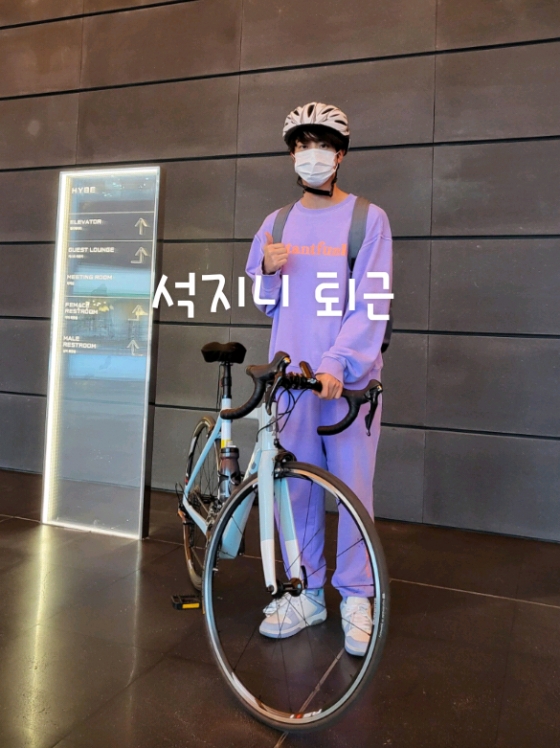 사진속에는 연한 보라색 트레이닝복을 입은 진이 배낭을 메고 헬멧을 쓴 채 한 손은 엄지척 포즈를 취하며 자전거와 서있는 모습이 담겨있다.