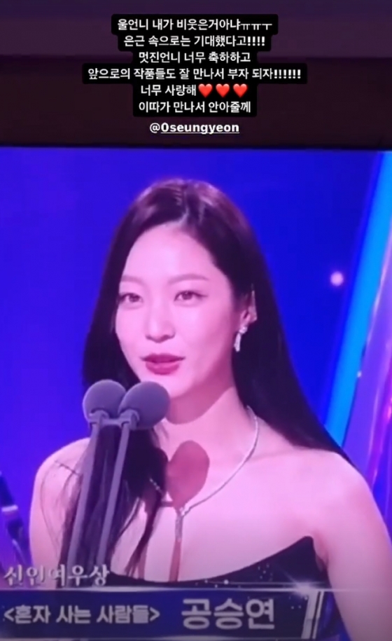 정연은 영상과 함께 "울 언니 내가 비웃은 거 아냐. 은근 속으로는 기대했다고. 멋진 언니 너무 축하하고 앞으로의 작품들도 잘 만나서 부자 되자. 너무 사랑해. 이따가 만나서 안아줄게"라고 적었다. 공승연이 수상 소감으로 "혹시나 내가 받을까 기대가 생겨 수상 소감을 준비했는데 동생이 비웃더라"라고 말하자 자신의 솔직한 마음을 전한 것.