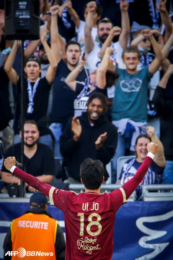 황의조가 2일 스트라스부르전에서 골을 넣은 뒤 보르도 팬들과 함께 기뻐하고 있다. /AFPBBNews=뉴스1