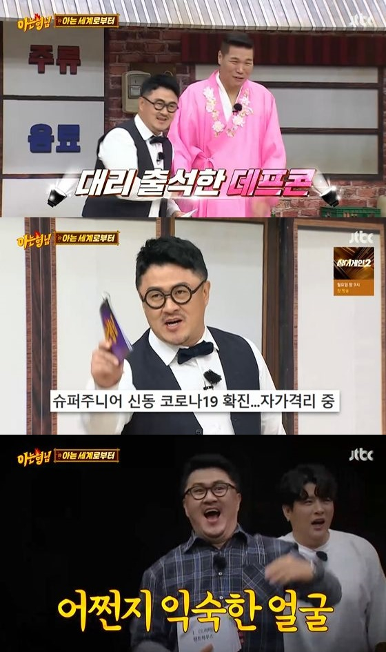 4일 오후 방송된 JTBC 예능프로그램 '아는 형님'에서는 격리중인 신동을 대신해 데프콘이 출연한 장면이 그려졌다.