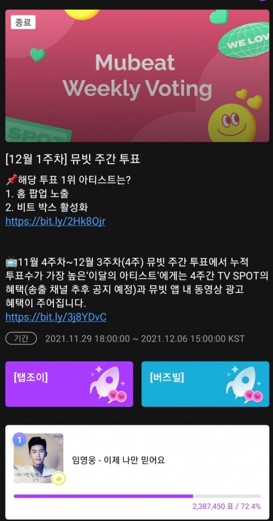 가수 임영웅이 뮤빗(Mubeat) 주간 투표 1위에 오르며 인기를 이어갔다.