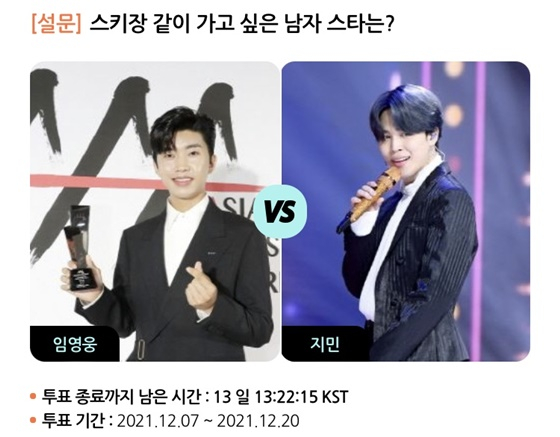임영웅과 방탄소년단 지민 중 올 겨울 스키장에 함께 가고 싶은 남자 스타는 누구일까.
