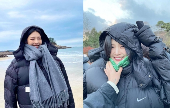 공개된 사진 속 조이는 바닷가에서 드라마 촬영에 한창인 모습이다. 두꺼운 검정 패딩과 목도리를 둘렀지만 그래도 부족한 지 핫팩까지 대고 있다.