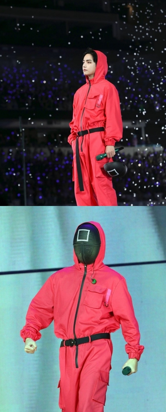 8일 뷔는 인스타그램에 미국 콘서트 셋째 날, '오징어 게임' 진행 요원의 복장을 하고 있는 모습과 마스크를 쓴 사진 두 장을 게재했다.