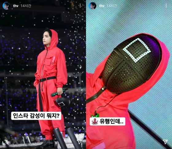 사진은 삭제됐지만 뷔의 인스타그램스토리에는 '오징어 게임' 의상을 입고 무대에서 팬들을 바라보고 있는 사진에 "인스타 감성이 뭐지"라는 코멘트를 한 사진과 오징어 이모티콘과 함께 "유행인데"라며 이해할 수 없다며 다소 억울한 심정을 토로해 팬들에게 웃음을 선사했다.