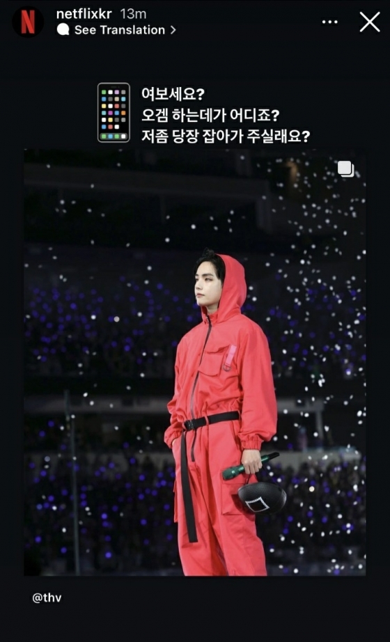 넷플릭스코리아는 뷔의 사진을 인스타그램 스토리에 게재하고 "어보세요? 오겜하는데가 어디죠? 저 좀 당장 잡아가 주실래요?"며 재치 넘치는 멘트를 붙였다.