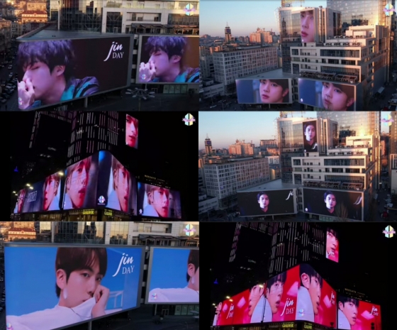 눈에 띄는 프로젝트 중 하나는 우크라이나의 유럽 최대 LED 스크린에 진의 얼굴이 송출된 것.