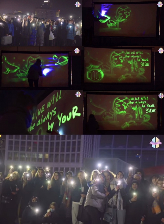 찰나의 빛이 서서히 사라진 공간에 마지막 빛이 만들어낸 '진 항상 네 곁에 있을게'(jin We will always be by your side)라는 글자가 떠오르자 큰박수 소리와 함께 진의 생일을 축하하는 수많은 팬들의 목소리가 울려퍼졌다.
