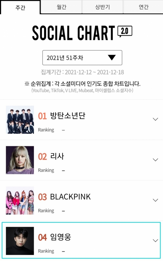 임영웅은 가온차트 51주차(2021년 12월 12일~2021년 12월 18일) 소셜차트 톱4를 기록했다. 임영웅은 남자 솔로 가수 중 최고 순위를 이어갔다.